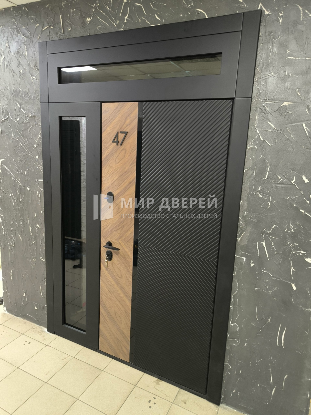 Дверь со стеклом и чёрной фурнитурой смотрится очень стильно! Замер был бесплатным, выбрала отделку под массив дерева. Всё сделали идеально!
